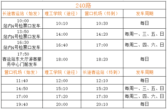 經(jīng)公司營(yíng)運(yùn)部門(mén)與機(jī)場(chǎng)工作人員溝通:從2018年3月25日起,營(yíng)口藍(lán)旗機(jī)場(chǎng)執(zhí)行新的航班時(shí)刻表(部分航線停發(fā))。針對(duì)上述情況,為方便市民出行,經(jīng)公司研究,現(xiàn)對(duì)機(jī)場(chǎng)240路運(yùn)營(yíng)班次進(jìn)行調(diào)整。具體內(nèi)容如下:
